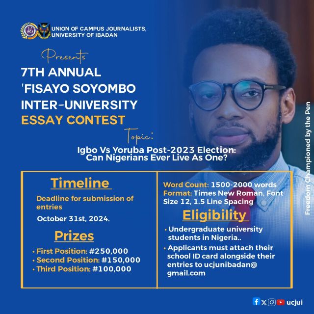The Union of Campus Journalists, University of Ibadan, has on Wednesday announced the commencement of the 7th annual ‘Fisayo Soyombo Inter-University Essay Competition.